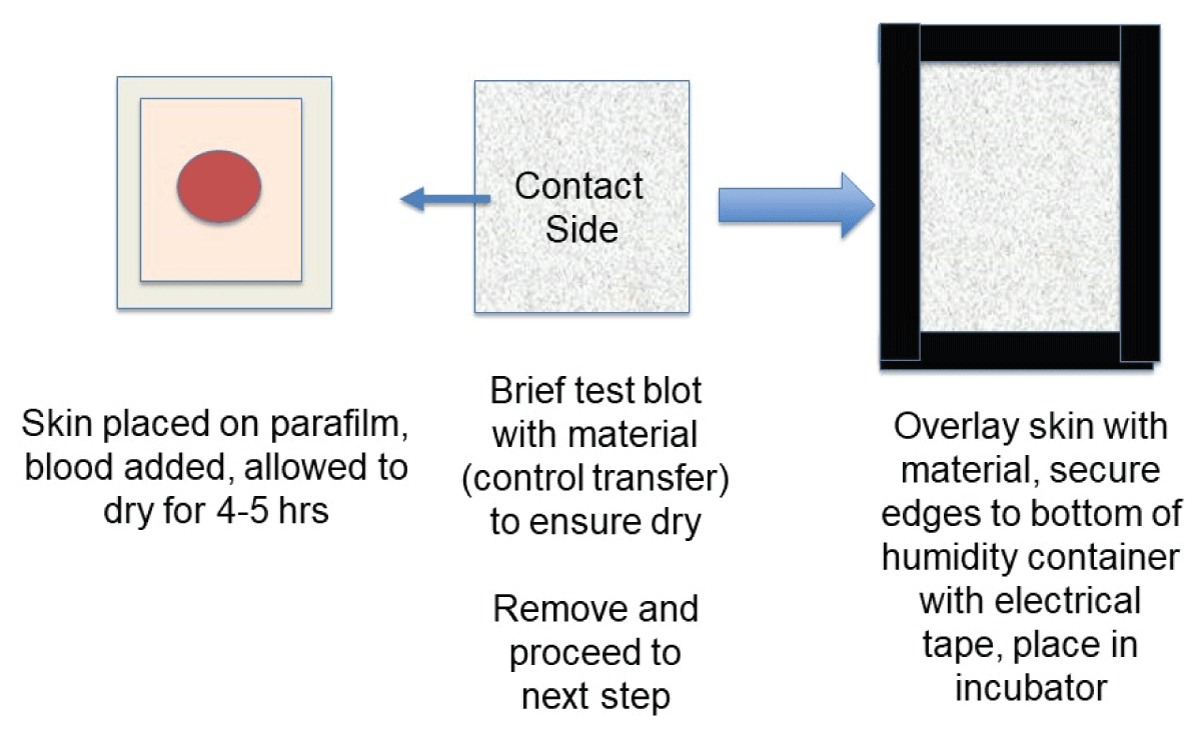For overlay experiments, an approximately 4 cm x 4 cm piece of porcine skin was placed on a piece of parafilm, blood added, and allowed to dry for 4-5 hours. To ensure that the blood was sufficiently dry such that no transfer initially occurred, a test blot (control transfer) was performed each time with a separate piece of material. The test material was then removed and the skin overlayed with a piece of cotton or linen. Electrical tape was used to secure the edges of the material to the humidity container and samples were placed inside of the incubator. At the end of the incubation period, the material was removed and photographed. Rainwater was collected and added to a 50 ml fine mist mini spray bottle. The bottle was held approximately 10 inches away from the subject and depressed 15-20 times. Samples were allowed to dry at room temperature and photographed.