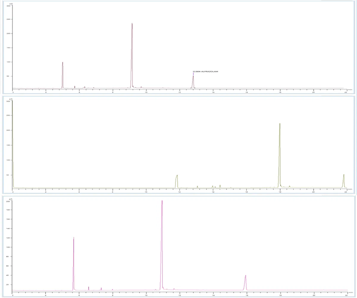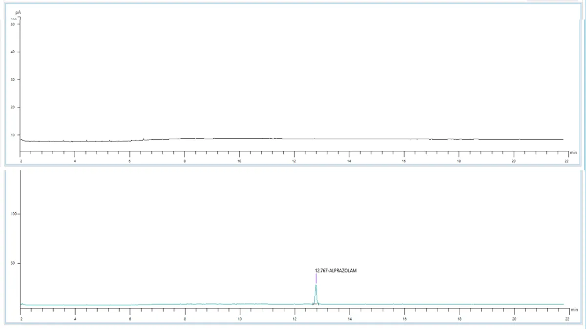 Selectivity: Selectivity was evaluated using a solvent blank and an extraction blank. Both the solvent blank and the extraction blank were first analyzed to check for background or preparation-related peaks. A placebo extract was then prepared using a typical sample that did not contain alprazolam following the same extraction procedure, and placebo extracts were spiked with alprazolam reference standard at low, medium, and high levels within the calibration range, then. Both preparations were analyzed in parallel with neat alprazolam standards. Chromatograms were compared. Representative seized tablet extracts were also prepared, analyzed, and subsequently post-spiked with alprazolam at a mid-level concentration and reviewed at the alprazolam to document the selectivity of the method.