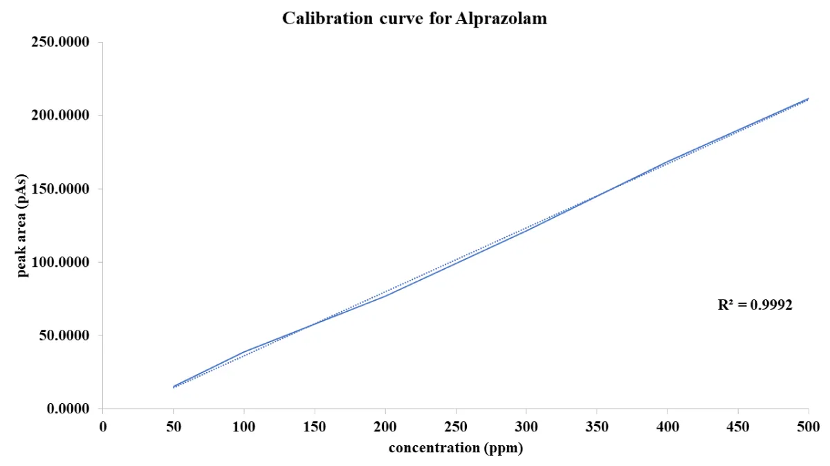 The limits of detection (LOD) and limits of quantification (LOQ), calculated using the signal-to-noise approach from matrix-spiked low concentration samples, were consistent with the sensitivity required for forensic analysis. Alprazolam was detectable at concentrations well below those reported in seized samples. The calculated LOD corresponded to a signal-to-noise ratio of 3:1was 13.78 ppm, while the LOQ derived from a ratio of 10:1 was 14.616 ppm, and both were verified by replicate injections of spiked quality-control samples at the LOQ level. These findings confirm that the method is sufficiently sensitive for casework applications, enabling the detection of alprazolam in poorly formulated or adulterated samples.