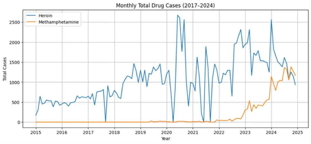 Descriptive analysis was first conducted to summarize the key characteristics of heroin and methamphetamine seizure data across the full study period. Monthly total drug cases and weight-category distributions were examined to understand the overall scale and variability of drug seizures. Time-based plots were generated to illustrate long-term patterns and highlight periods of unusually high or low seizure volumes. This provides an overview of how trafficking activity evolved and established a foundation for more advanced analytical techniques. Correlation analysis was performed to explore the relationship between heroin and methamphetamine seizures across months and weight categories. Pearson correlation coefficients were calculated to determine whether increases or decreases in one drug's cases were associated with similar changes in the other. A correlation heatmap was used to visualize these relationships. This analysis helped assess whether the two drugs followed similar temporal patterns or operated independently within the observed period.