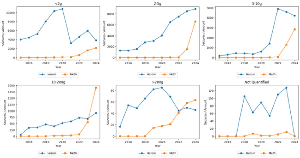 This study analyses multi–year drug seizure records for heroin and methamphetamine, categorized by weight classes and reported monthly. The objective is to uncover temporal patterns, detect anomalies, compare cross-drug dynamics, and develop early-warning indicators for high-risk periods.