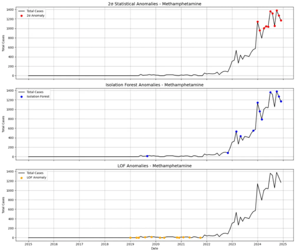 To discover sudden changes in the seizure activity, which might reflect enforcement action or transportation disturbance, an anomaly detector was chosen to detect the abrupt change in the temporal drug seizure data. Anomalies in monthly drug seizure cases were identified using a combination of statistical and machine learning approaches. A simple 2σ statistical method was first applied to the total number of cases, flagging months where the counts deviated significantly from the mean.