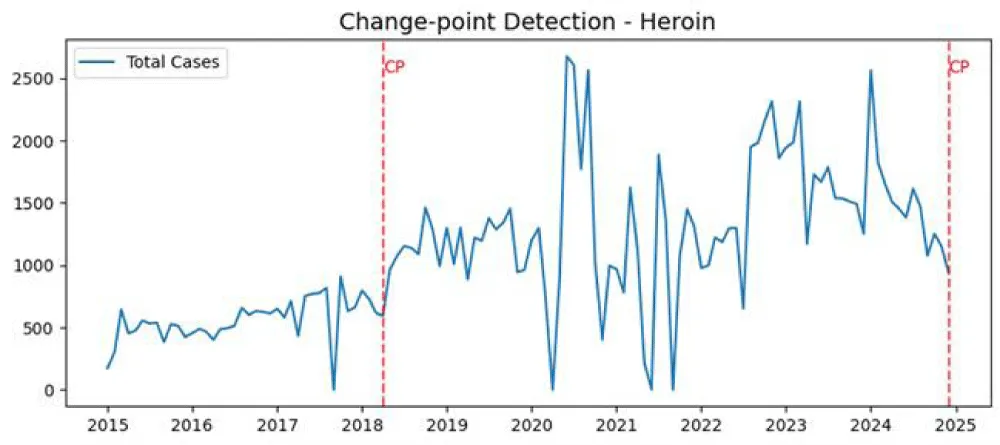 Change-point analysis is especially appropriate to discover structural discontinuities in longitudinal seizure data, and allows one to discover discontinuities that could reflect policy, enforcement intensity, or the development of trafficking. The Pelt method is used to detect the change point. This is used to identify structural breaks in the time series where statistical properties change abruptly. The changes detected here can indicate significant shifts in trafficking behavior due to various reasons, such as alterations in drug routes, variations in enforcement intensity, market disruptions, or the introduction of new smuggling techniques.