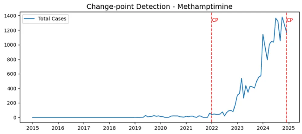 The change point detection analysis reveals distinct structural transition periods for heroin and methamphetamine, indicating substance-specific temporal dynamics. In the heroin time series in Figure 6, the first detected change point occurs between 2018 and 2019, marking a shift in the underlying statistical behavior of the data. A second change point in the heroin series is detected in 2025, signifying another major structural shift. This late change implies a substantial alteration in the heroin-related dynamics toward the end of the observation period. In contrast, the methamphetamine time series in Figure 7 exhibits a different change point pattern. The first change point appears in 2022, indicating a delayed structural shift compared to heroin. Similar to heroin, a second change point is detected in 2025, pointing to a concurrent late-stage structural transition affecting both substances.