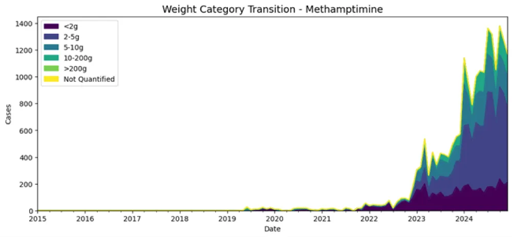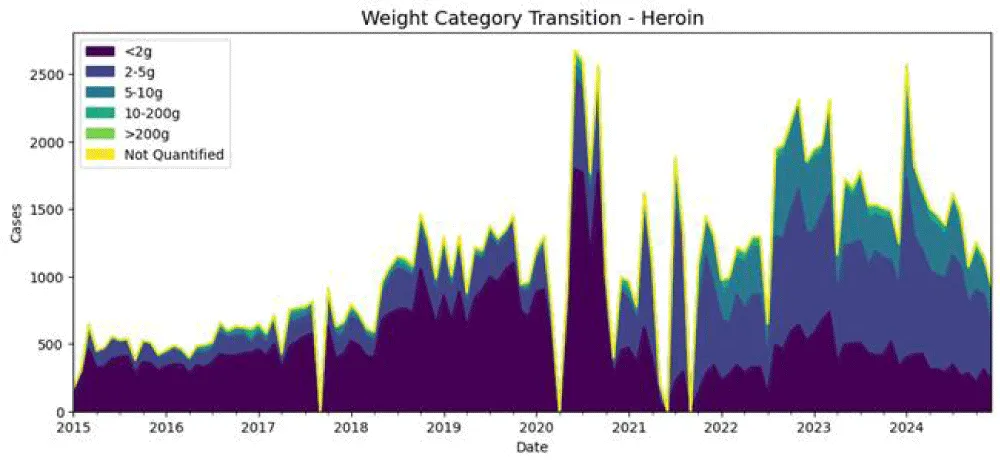 Weight-category transition modeling was performed to investigate how seizures evolve across different quantity categories over time. By examining transitions from small quantities (e.g., <2 g) to larger quantities (e.g., >200 g), it is possible to understand whether trafficking operations are scaling up, diversifying, or shifting focus. Visualizations such as stacked area plots allow researchers to track the proportional changes in each weight category over time, revealing structural patterns in the supply chain and operational strategies of traffickers.