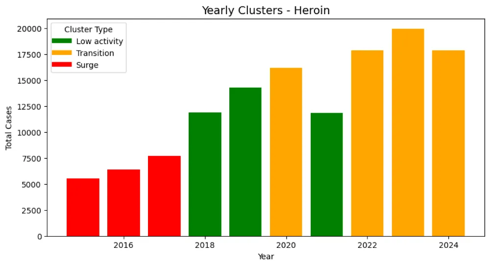 Clustering techniques were employed to group months or years with similar seizure patterns. This makes it possible to introduce groups of years with a similar profile of activities and identify high-activity periods and structural similarity patterns of drug incidents. Yearly drug case data were first aggregated by summing the total number of recorded cases for each calendar year. To ensure comparability across years and to stabilize distance-based clustering, the yearly totals were standardized using z-score normalization. K-means clustering with k=3 was then applied to the standardized yearly counts, grouping years with similar magnitudes of drug cases based on Euclidean distance. The number of clusters was set to k = 3 to reflect meaningful activity phases in the seizure data: low, moderate, and high intensity periods. The resulting clusters were subsequently interpreted as distinct prevalence regimes, representing "low", "transition", and "surge" periods. This clustering approach provides an intuitive, magnitude-based segmentation of long-term trends, enabling the identification of structural changes in yearly drug case patterns without imposing any temporal or causal assumptions.