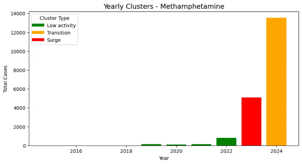 As shown in Figure 10, the final yearly cluster highlights the transition between low and high weight categories. For heroin, the years 2020, 2022, 2023, and 2024 predominantly fall into the high-case cluster compared to other years, indicating elevated activity levels. In contrast, for methamphetamine, as shown in Figure 11, 2024 exhibits a rapid increase into the high-case cluster, whereas the other years are largely characterized by lower cases and transitional activity.